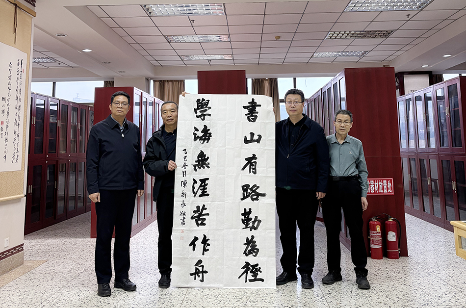 当天下午还举行了书法交流活动,公司王永斌老师应邀参加。两位书法家现场挥毫,进行了全方位的作品展示和艺术对话。陈新长特为图书馆题写对联“书山有路勤为径,学海无涯苦作舟”,以示勉励。