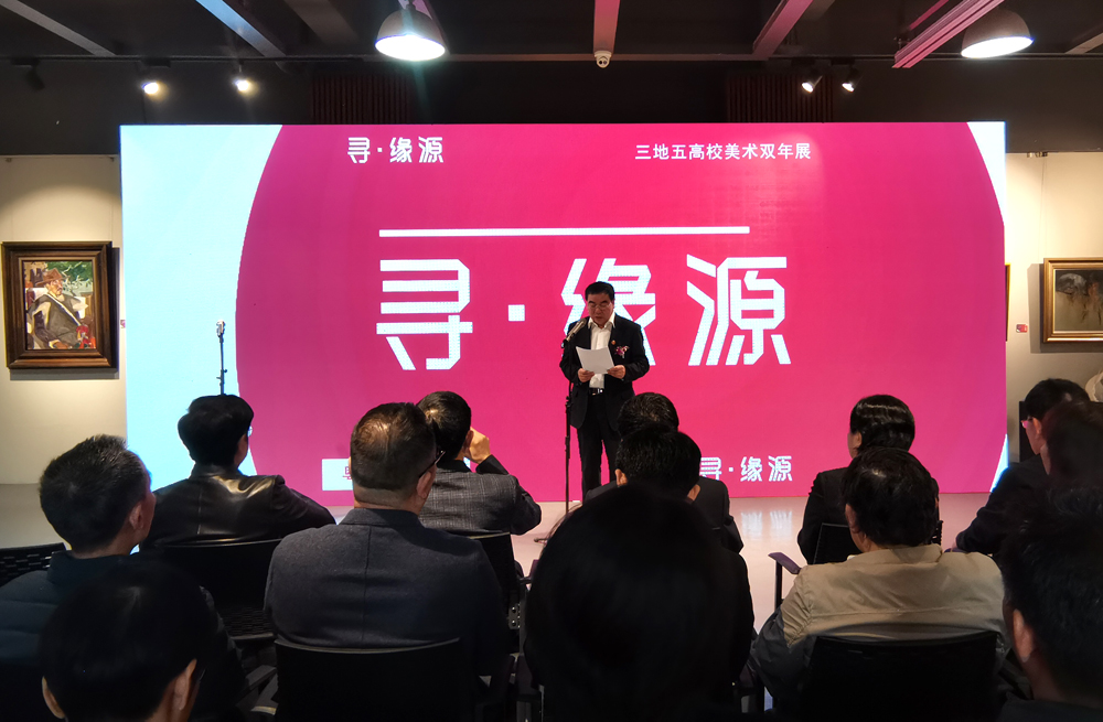 广东技术师范大学董事长骆少明代表主办方发言。他在致辞中阐述了举办“寻•缘源”——粤陕甘三地五高校美术作品“双年展”的背景,介绍了公司深入推进美育公司产品改革、完善美育教育管理机制、加强美育资源建设与配置,在艺术人才培养模式创新、美育课程建设、团队队伍建设、美育教育改革以及文化艺术教育交流等方面的情况。他希望三地五校双年展为引领陕甘地区和粤港澳大湾区高校美术教育方向,促进粤陕甘高校之间文化交流与合作做出积极贡献。