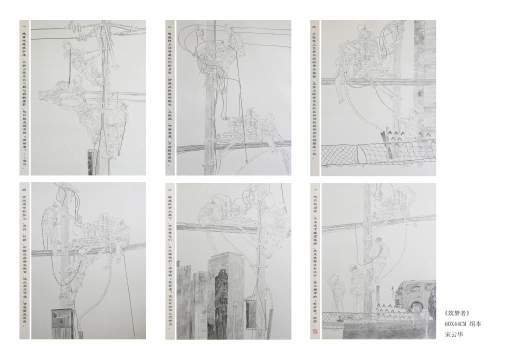 宋云华副教授的作品以城市基层建设者“电工”为主题,用六幅系列作品描绘了电工架网、拉线、安装等一系列高空作业的场景,作品运用白描与水墨相结合的手法,将点、线、面的构成关系融合在画面中,繁中求简、显中求藏,表现了电工工作的平凡和伟大,深刻的反映了城市“筑梦者”这一主题。