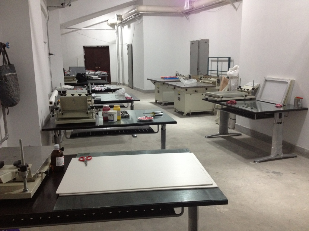 该实验室拥有全套同步丝网印刷成套设备,可以完成从制版到印刷的全过程。其中印前设备包括:绷网机、曝光机、烘干机、清洗池、拷贝台等。印刷工艺设备包括:对开自动丝网印刷机、四开手印台式丝网印刷机和晾晒架等,总投资16万元。