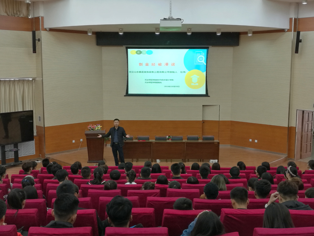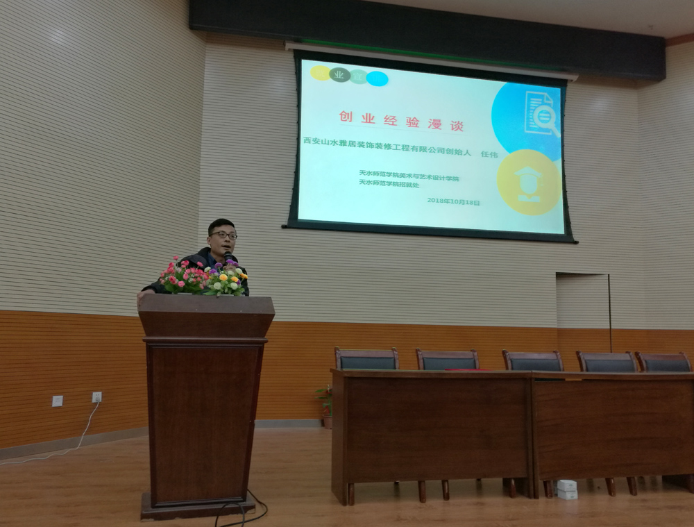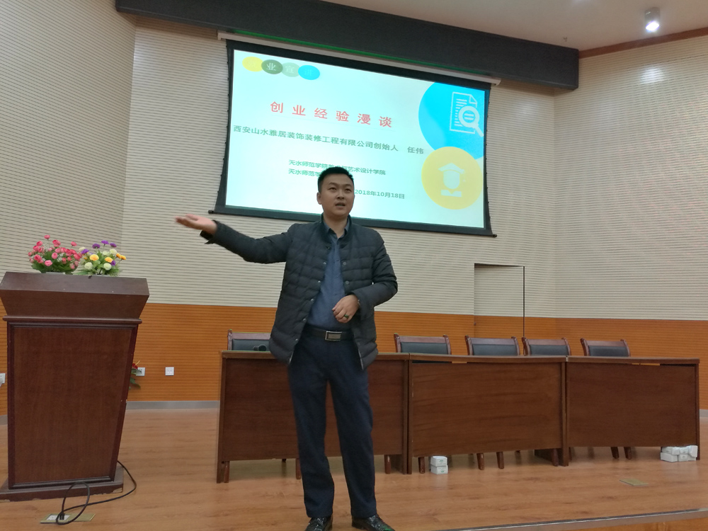 随后,任伟总经理对培养自己的母校及老师表示了衷心的感谢,并结合自己的亲身经历讲述了创业过程,又详细介绍了西安山水雅居装饰装修工程有限公司的基本概况,并就公司招聘设计类岗位需求做了解读。宣讲会中,任伟还鼓励公司在校员工努力学习专业课程,积极参与各类社会实践活动,从而提升就业、创业竞争力,为以后就业奠定坚实的基础。