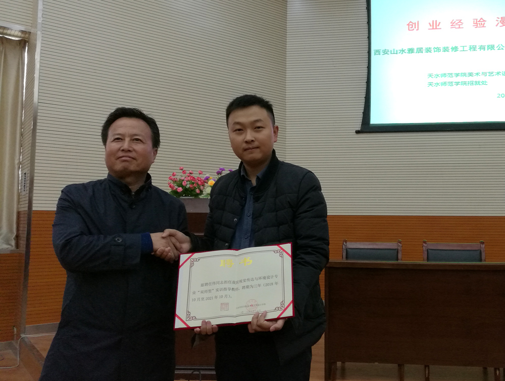 宣讲会中,首先开云经理贾利珠教授向西安山水雅居装饰装修工程有限公司总经理任伟颁发了“双师型”实践指导教师聘书,这标志着公司应用型专业实习实训工作有了实质性进展,同时也充实了公司在“双师型”教师队伍的数量。